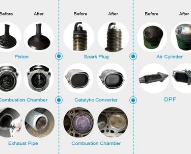 The images clearly demonstrate the effectiveness of an Engine Carbon Clean service by showcasing the dramatic "Before and After" state of critical engine components. Before the service, parts like the Piston, Spark Plug, Air Cylinder, and Combustion Chamber are heavily encrusted with thick, black carbon deposits, which severely restrict efficiency and performance. Furthermore, key filtration systems like the Catalytic Converter and DPF (Diesel Particulate Filter) are shown to be clogged, leading to high emissions and potential system failure. After the decarbonization process, these same components are restored to a clean, metal finish. This removal of carbon translates directly into restored compression and combustion efficiency, a cleaner exhaust, reduced likelihood of component failure, and ultimately, better MPG and power for the vehicle owner.