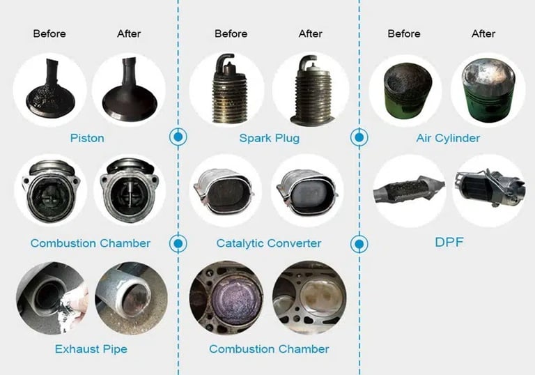 Witness the remarkable transformation of engines from carbon buildup to pristine condition, showcasing our effective cleaning process on a variety of vehicles including cars and trucks.